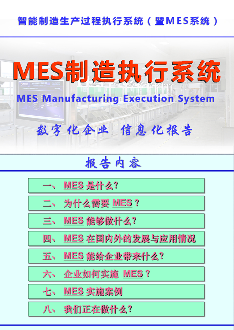 一、MES 是什么?二、为什么需要 I MES ? 三、MES能够做什么?四、MES 在国内外的发展与应用情况五、MES能给企业带来什么?六、企业如何实施 MES ?七、MES 实施案例八、我们正在做什么?