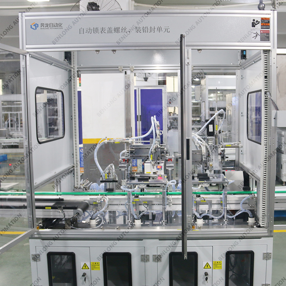 具有产品自动上料底座、装配导电柱、装配线路板、锡焊、锁螺丝、装配密封圈、装配玻璃罩、装配外圈、锁螺丝、特性检测、