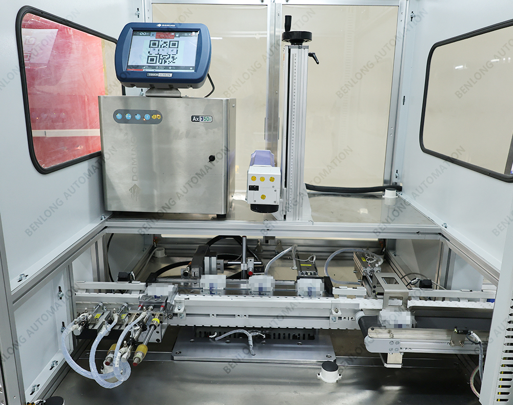 具有自动激光打标二维码或产品ID码、CCD检测、不良品区分、缺料报警、竖立翻转水平、水平翻转竖立等工序的在线监测、实时监控、质量溯源、条码识别、关键元器件寿命监测、