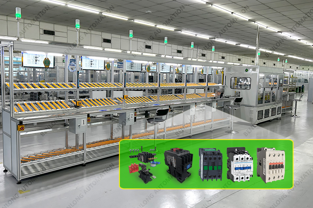 具有自动上料、插芯装配、底座装配、主辅静触头装配、人工装配宝塔弹簧、锁上下盖螺丝、锁瓦片螺丝、通断、耐压、功耗、