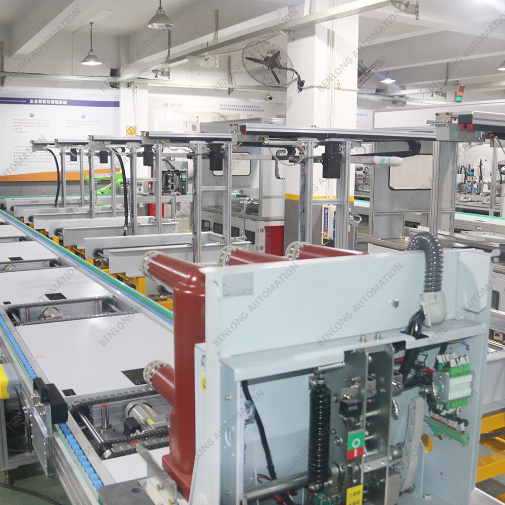 具有自动AGV物流输送、龙门架自动上料、倍速链物流、绝缘筒装配、灭弧室装配、初调装配、初调翻转、机器人锁螺丝、开距、