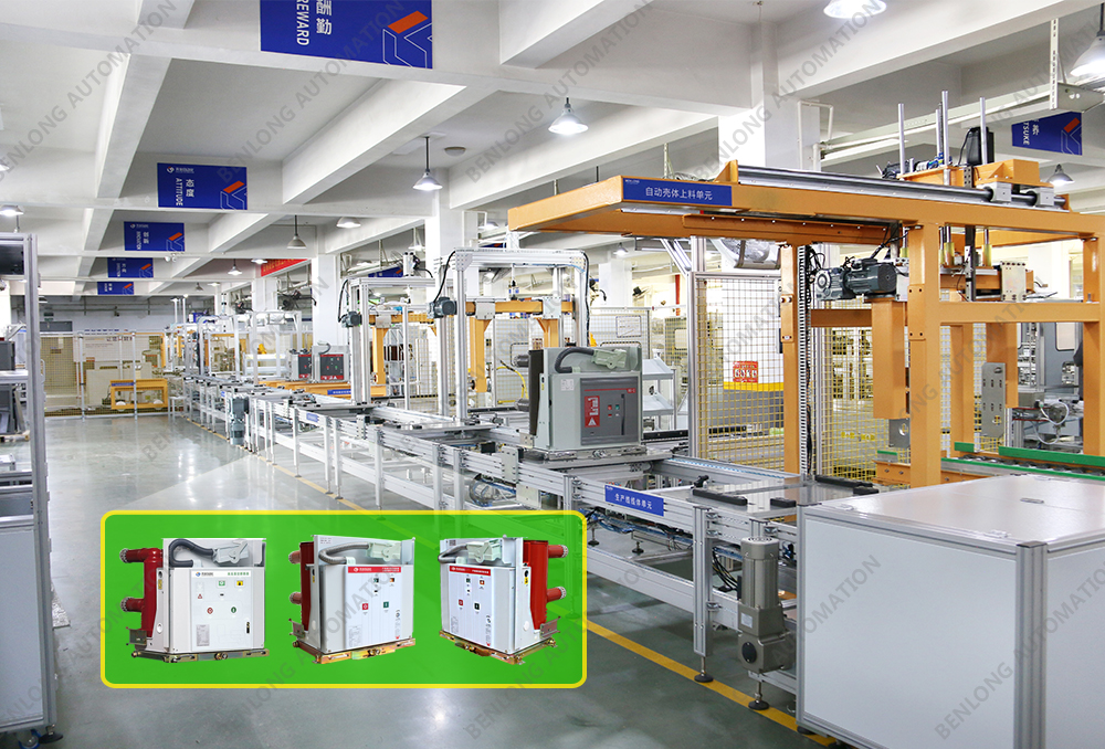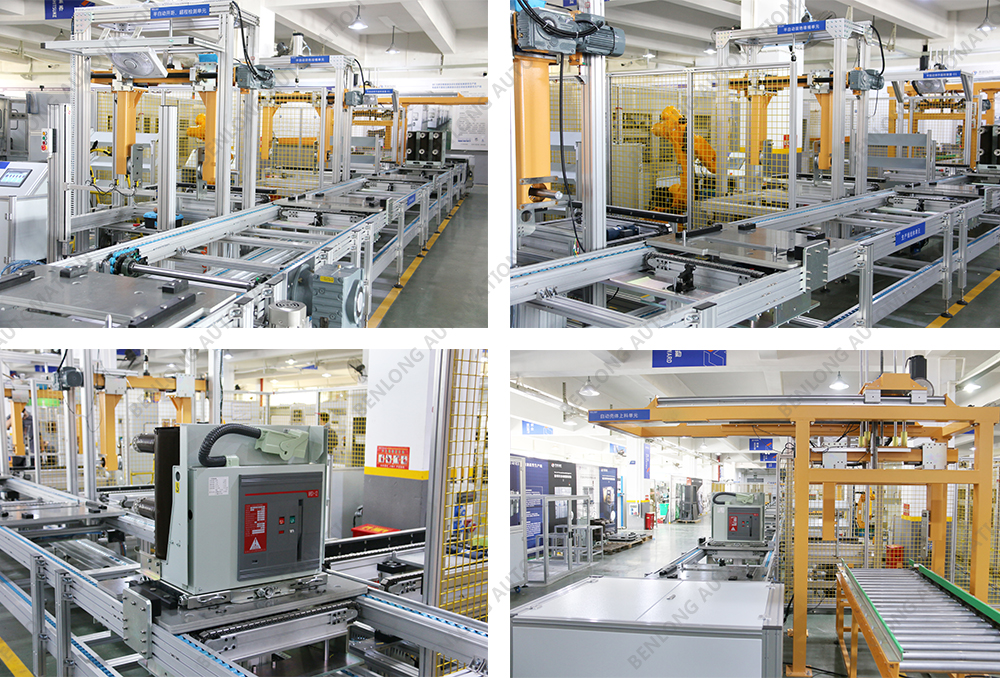 具有自动AGV物流输送、龙门架自动上料、倍速链物流、绝缘筒装配、灭弧室装配、初调装配、初调翻转、机器人锁螺丝、开距、超程、总程、磨合检测、机械特性检测、分合闸速度、同步性、A相合闸时间、B相合闸时间、C相合闸时间、触臂触头装配、耐高压(10KVA)、回路电阻、底盘车装配、机器人锁螺丝、底盘车翻转、底盘车接线、外观封板装配、二次综合检测、龙门架自动下料、包装、码垛、AGV物流输送、缺料报警等工序的装配、在线检测、实时监控、质量溯源、条码识别、元器件寿命监测、数据存储、MES系统与ERP系统联网、参数任意配方、智慧能源分析与节能管理系统、智能装备服务大数据云平台等功能。