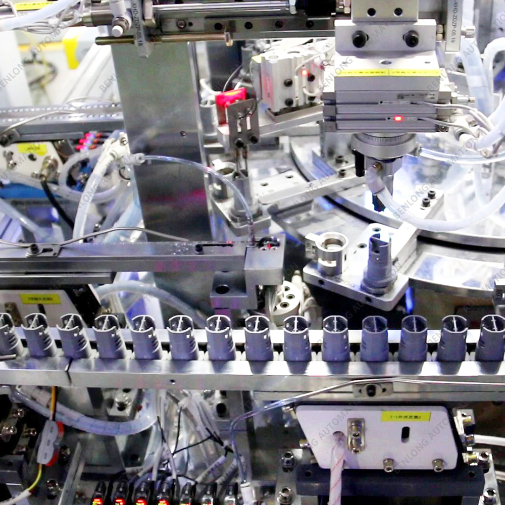 具有产品自动上料、锡焊、装帽盖、装胶圈、装塑料螺母、锁螺丝、移印、激光标刻、检测、合格不合格区分、