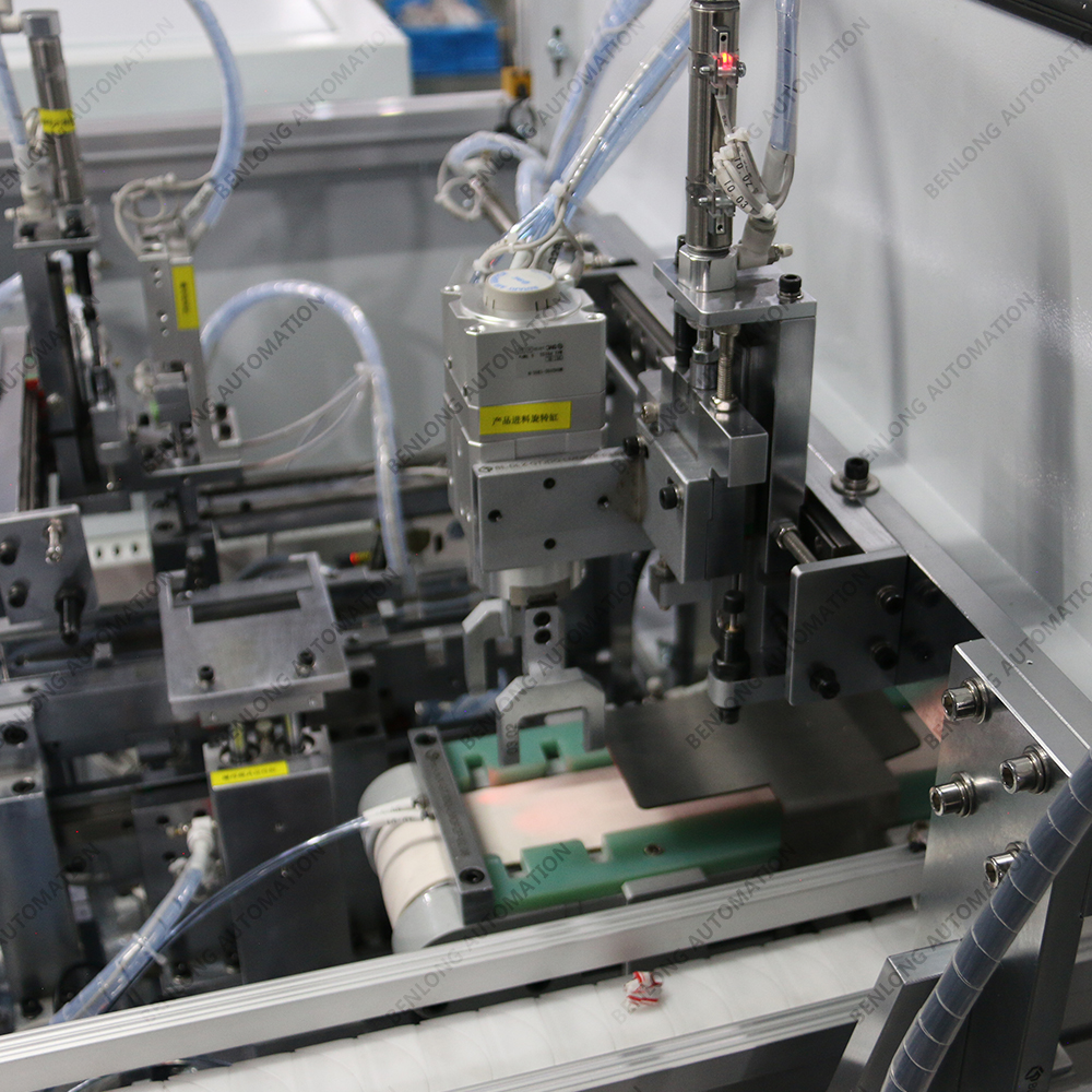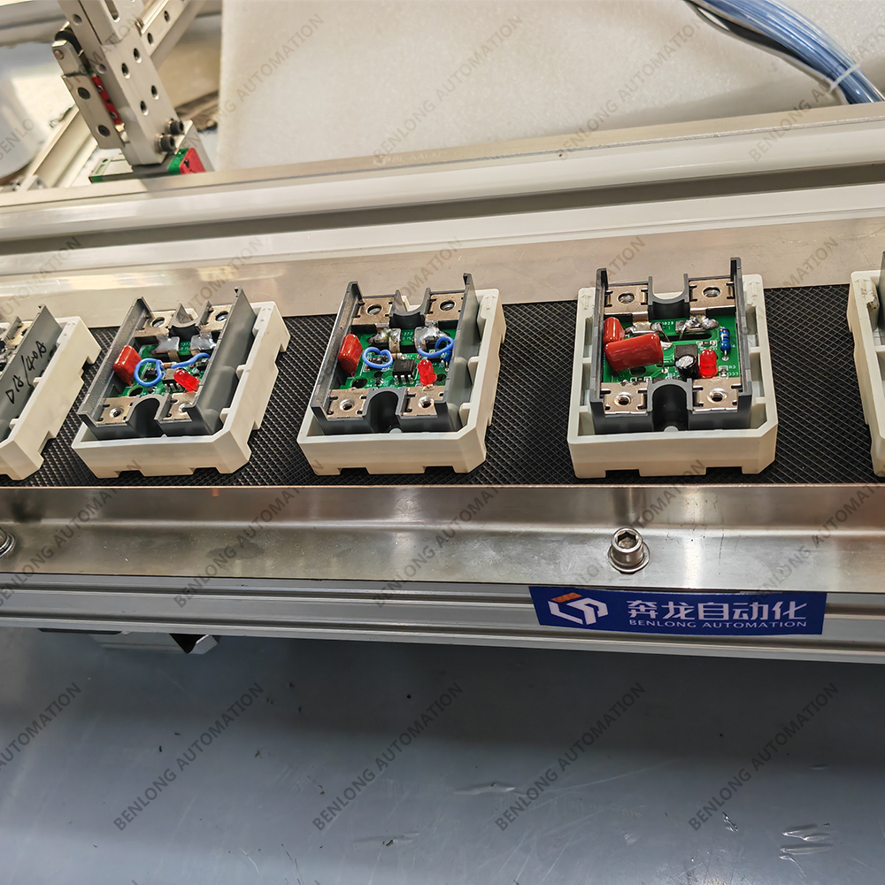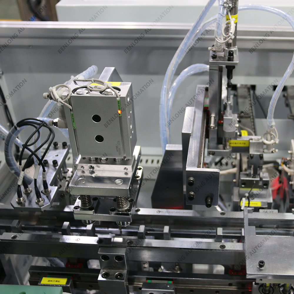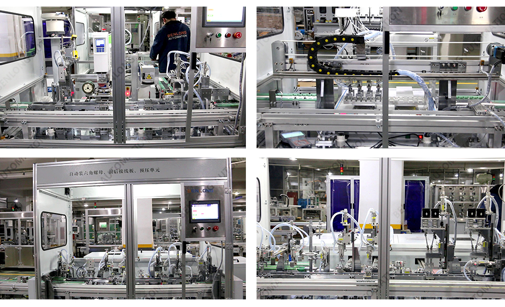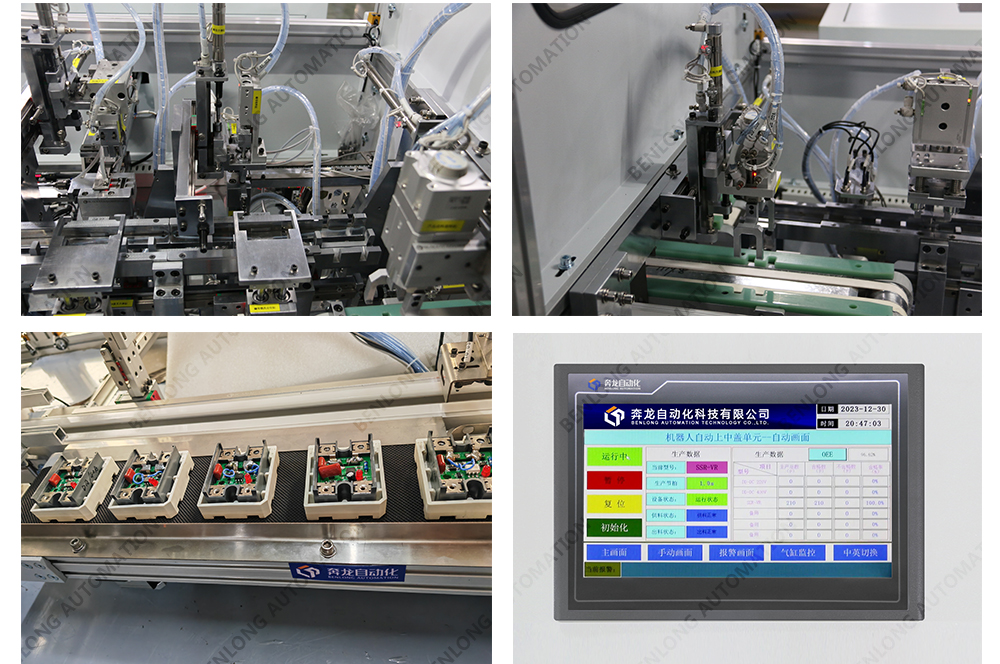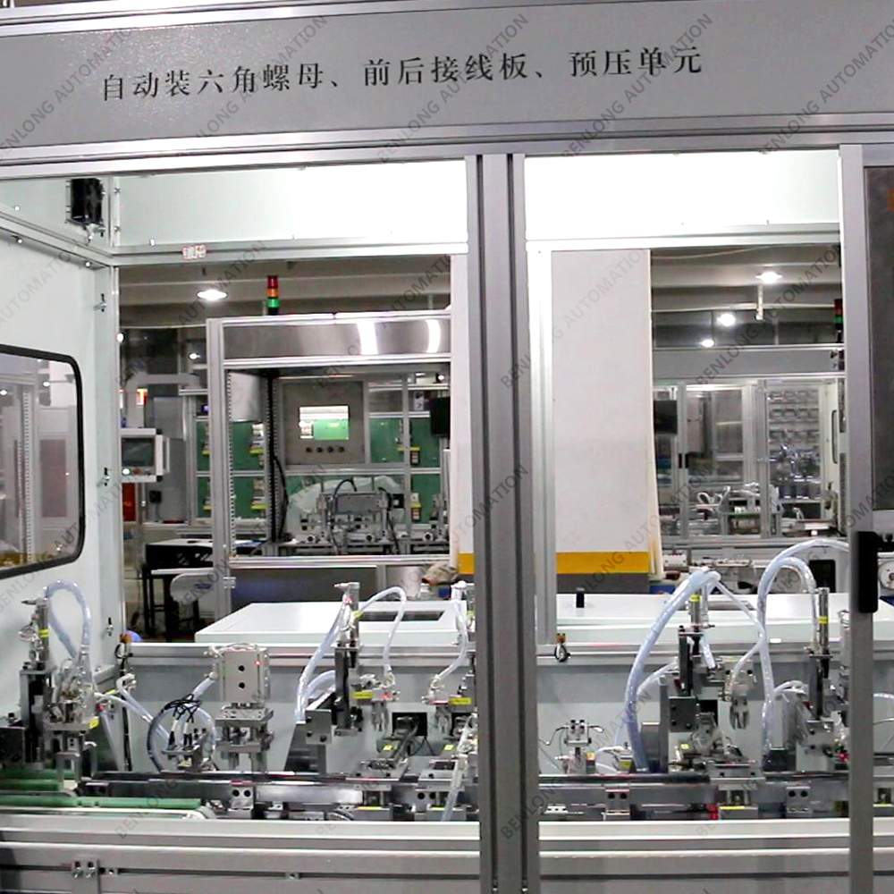 自动装配六角螺母、自动装配前接线板、自动装配后接线板、自动预压、自动锡焊上针脚、自动锡焊下针脚、自动CCD视觉检测、自动通断检测、自动耐高压检测、