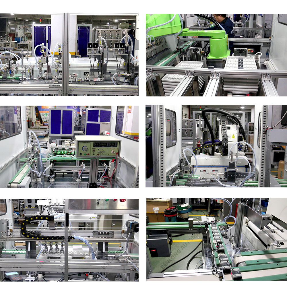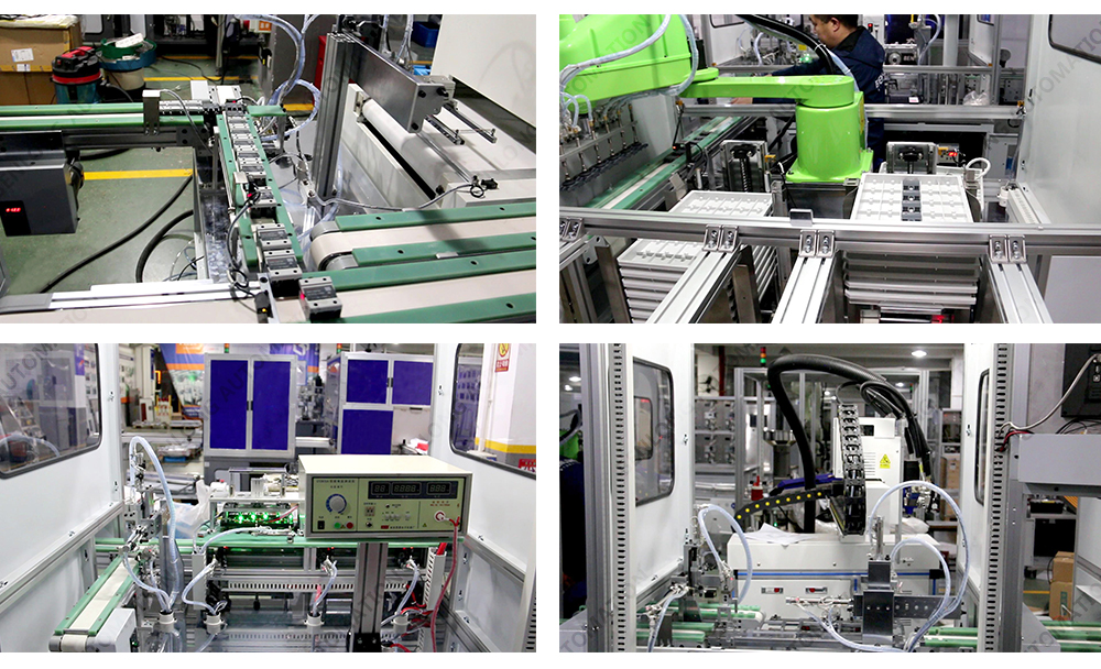 自动初校检测、自动加注A/B树脂胶、上盖机器人自动上料、自动装配上盖、自动激光打标、自动移印商标、自动装配导光柱、自动锁瓦片螺丝、自动装配前后上翻盖、