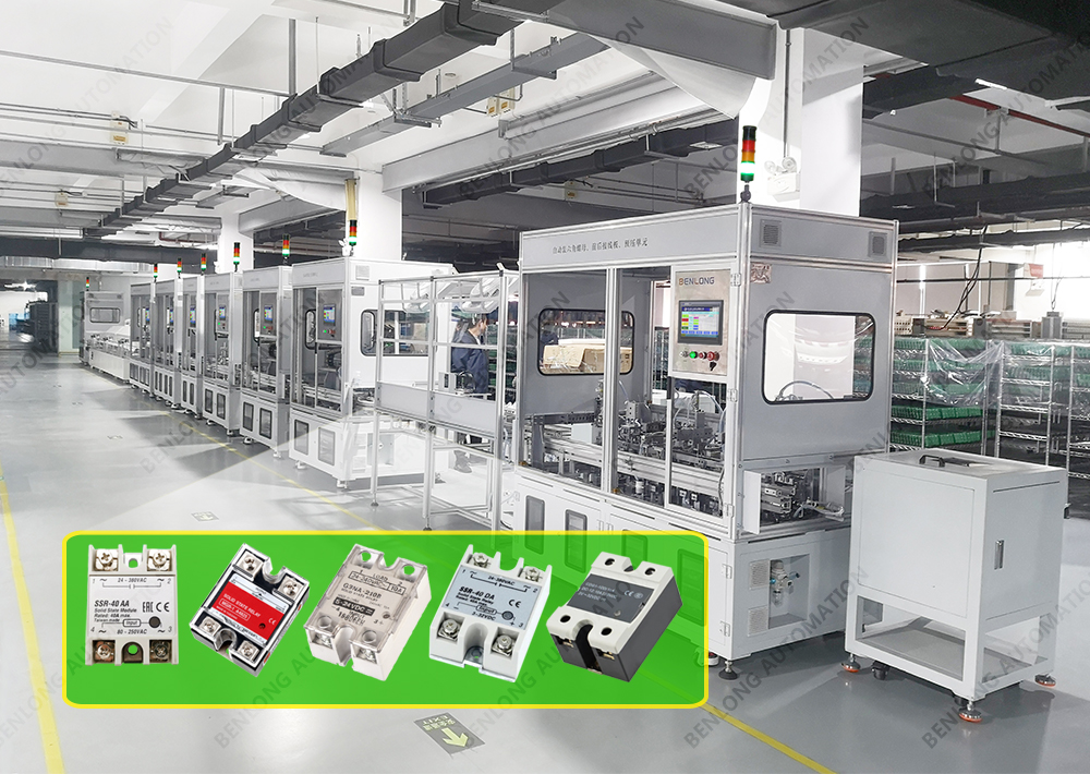 这是一条《固态继电器自动装配检测生产线》,该生产线的工序包括:底板自动上料、外壳自动上料、自动涂抹锡膏、自动加热熔化、自动装配电子元器件、