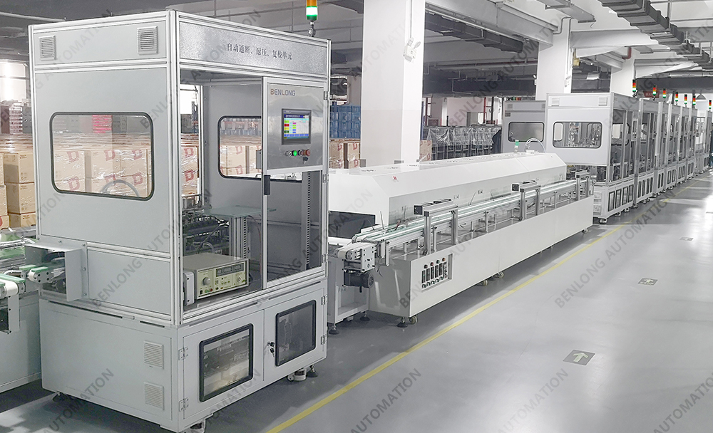 自动CCD视觉检测、自动隧道炉加热固化、自动循环冷却、自动通断检测、自动耐高压检测、自动复校检测、不良品自动区分、成品缓存、自动摆盘、自动包装、
